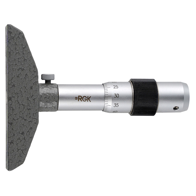 Глубиномер микрометрический RGK GM-50 предназначен для высокоточного контроля геометрических параметров различных изделий, обеспечивая определение высоты выступов и глубины отверстий, углублений и выемок относительно опорной поверхности. Изготовленный в таком же конструкционном исполнении, как младшая модель серии, прибор снабжен дополнительным измерительным стержнем калиброванной длины с винтовым креплением, что позволяет выполнять замеры в диапазоне не только 0 - 25 мм, но и 25 - 50 мм. ОсобенностиШкала микрометрического глубиномера с отчетливыми гравированными отметками на стебле и барабане позволяет считывать показания с погрешностью не более ±4 мкм. Плоские твердосплавные поверхности измерительных стержней, обработанные методом высокоточного шлифования, характеризуются улучшенной износостойкостью. Стопорный винт в основании дает возможность фиксировать вылет микрометрического винта при считывании показаний или при перенастройке измерителя, либо при снятии и установке сменных элементов. В комплект поставки включены ключи для замены стержней и выставки начального положения шкалы барабана, а также жесткий футляр для хранения и переноски инструмента.