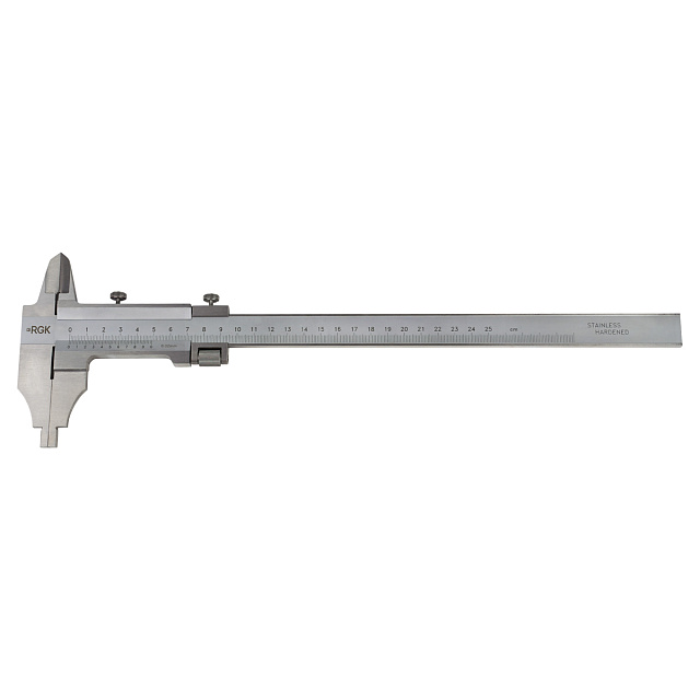 Штангенциркуль называется SCM-II-250, где SC означает - штангенциркуль, M - механический, II - второй тип, а 250 - это максимальное значение измерений в мм. Штангенциркуль RGK SCM-II-250 предназначен для использования на производстве с механической обработкой изделий и при проведении ремонтных работ устройств, машин и агрегатов, обеспечивая измерение линейных размеров, внутренних и внешних диаметров в диапазоне до 250 мм. Отсчет по нониусу на 50 делений позволяет получать результаты разрешением 0,02 мм. Помимо измерительных задач, инструмент также подходит для выполнения необходимой разметки, для чего предусмотрена возможность дооснащения стандартным приспособлением с резками-накладками на губки. ОсобенностиУстройство тонкой установки рамки штангенциркуля, оборудованное отдельным зажимающим элементом и микрометрической винтовой парой с широким маховиком, позволяет с высокой точностью регулировать вылет губок, задавая нужный размер при проведении разметочных операций. С обратной стороны инструмента имеется таблица со справочными данными соответствия резьбы по ISO и Витворту – метрической и дюймовой, с указанием для каждого типоразмера диаметра подходящего сверла. Шкала нониуса выгравирована непосредственно на рамке, без накладок с винтовыми соединениями. Углубление в месте нанесения шкалы штанги исключает истирание миллиметровых делений рамкой при интенсивной эксплуатации инструмента.