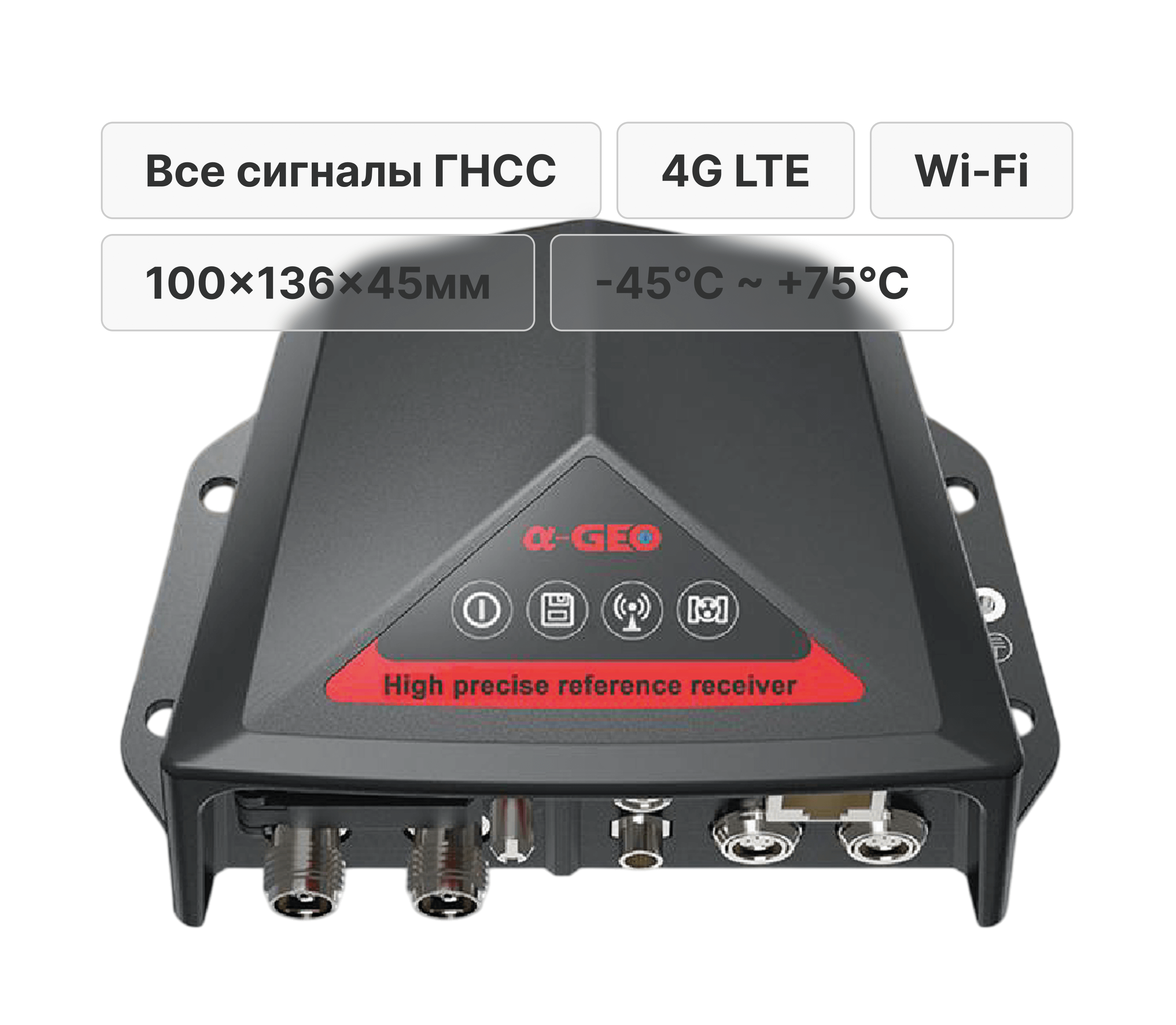- Благодаря удобной компоновке всех функциональных модулей приемника, его корпус удалось сделать легким и компактным, а благодаря материалам и защите IP68 корпус обеспечивает надежную работу приемника в экстремальном диапазоне температур от -45°С до +75°С.
